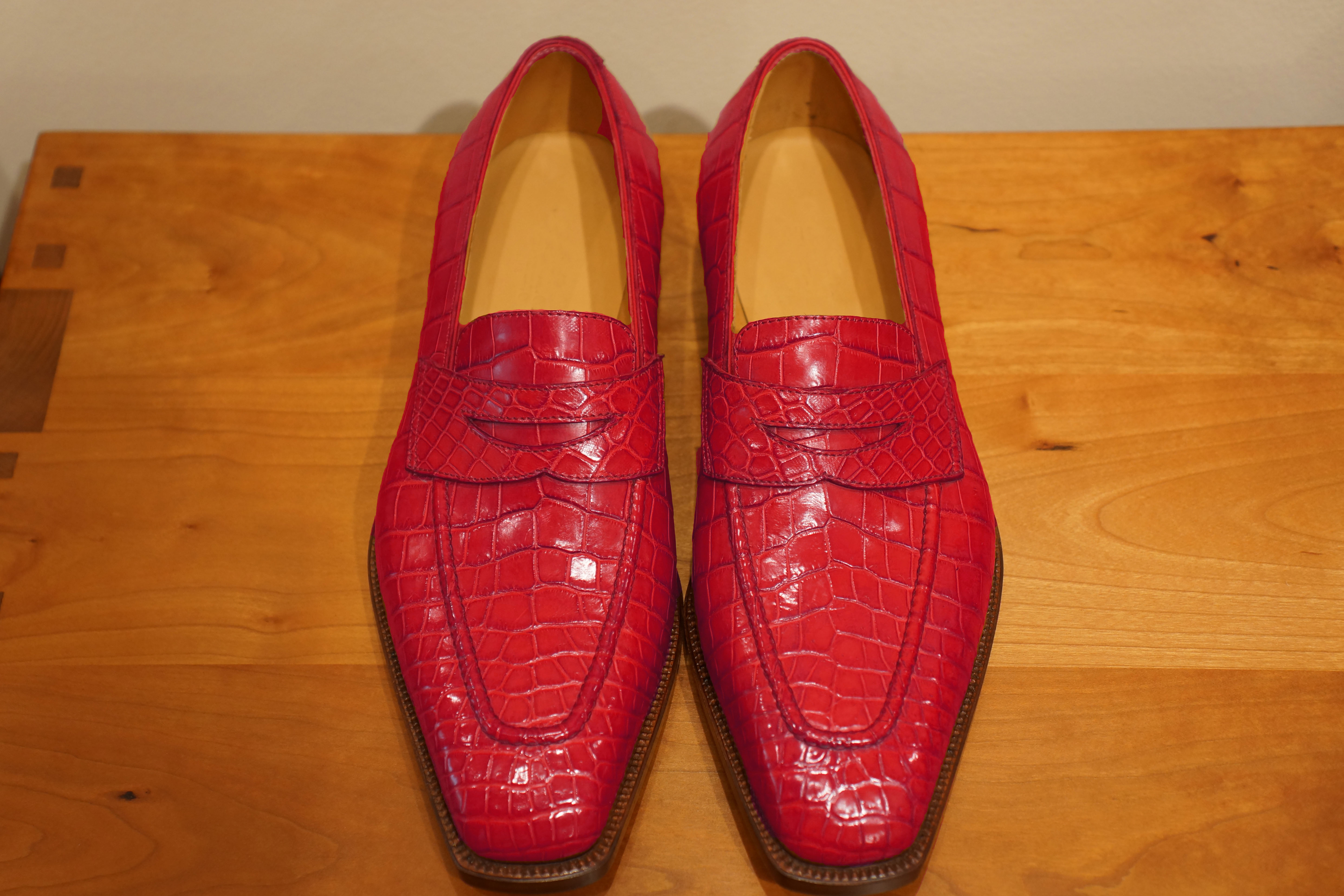 Handmade Men's Red Alligator Texture Beautiful Penny Loafers Moccasin Dress Shoes