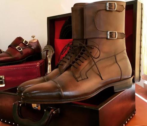 Men's Double Monk Brown Leather Lace Up Dress Boot Handmade Boots