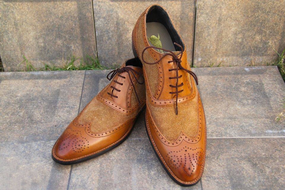 Men's Wheat Brown Combination Oxfords Wingtip Handmade Formal Lace Up Shoes