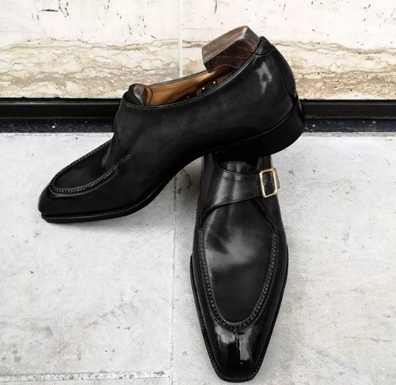 Men's Business Tour Black Leather Single Monk Strap Dress Shoes Handmade