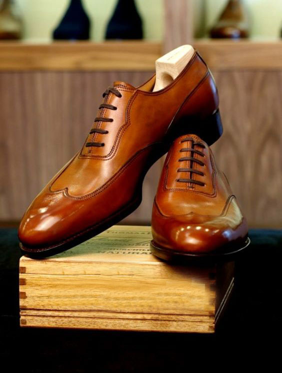 Men's Cognac Leather Handmade Wedding Wingtip Shoes