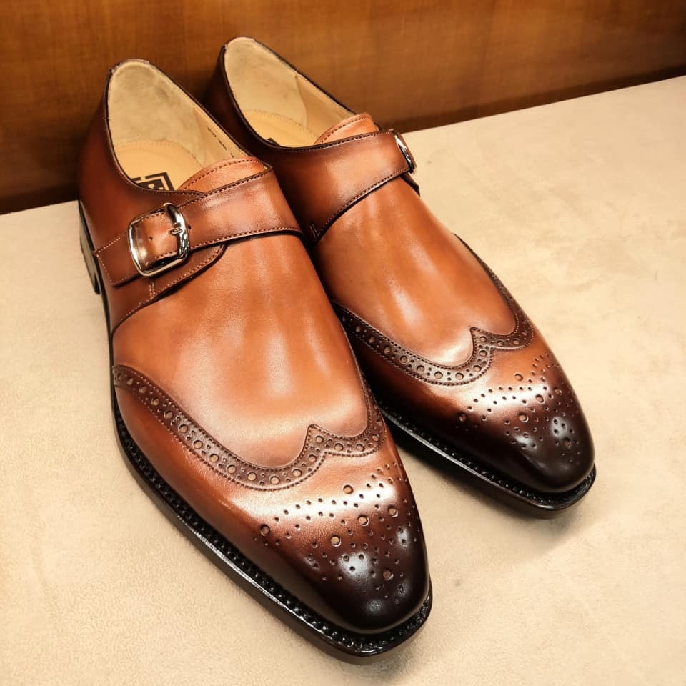 Handmade Men's Brown Wingtip Single Monk Strap Shoes