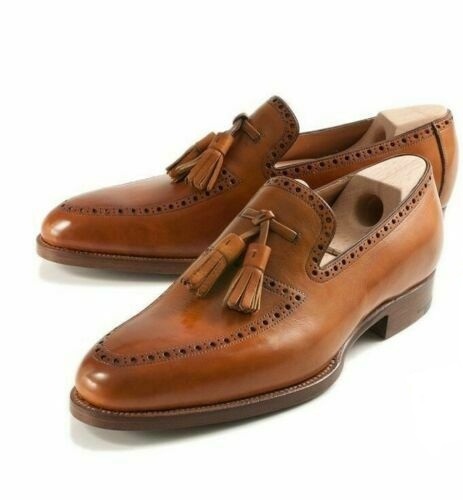 Luxury Men's Hand Stitch Brown Tassels Loafers Style Leather Shoes