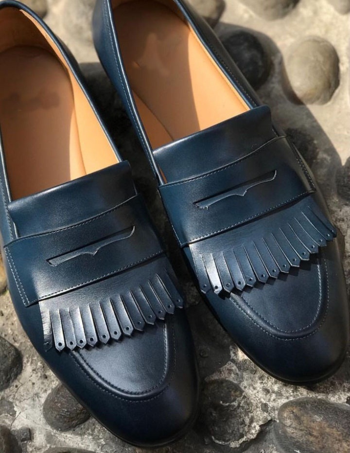 Handmade Men's Navy Blue Fringe Moccasin Leather Shoes