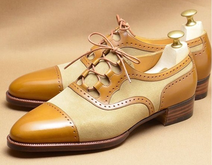 Trendy Men's Hand Made Brown Beige Cap Toe Shoes, Leather Suede Lace Up Party Wear Shoes