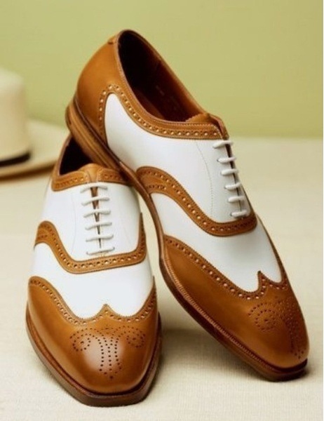 Classic Hand Stitch Men's Oxfords White Brown Contrast Genuine Leather Lace Up Shoes