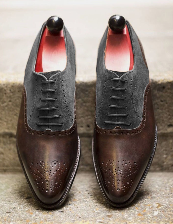 men brown leather grey contrast decent hand stitch brogue lace up formal dressing shoes