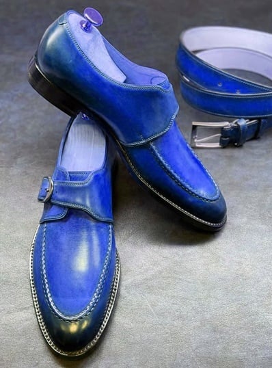 Handmade Men Black Tone On Blue Leather Casual Wear Monk Strap Shoes