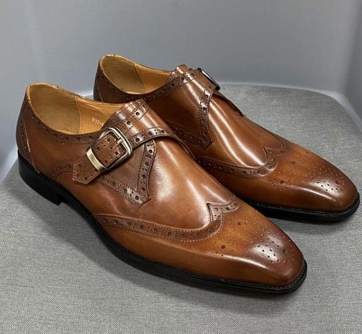 Elegant Men's Hand Made Brown Single Monk Shoes, Genuine Leather Brogue Shoes