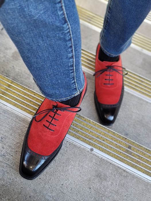 Luxury Men's Hand Stitch Red Black Shoes, Leather Suede Lace Up Shoes