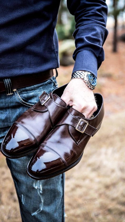 Hand Stitch Men's Brown Single Monk Strap Leather Formal Shoes