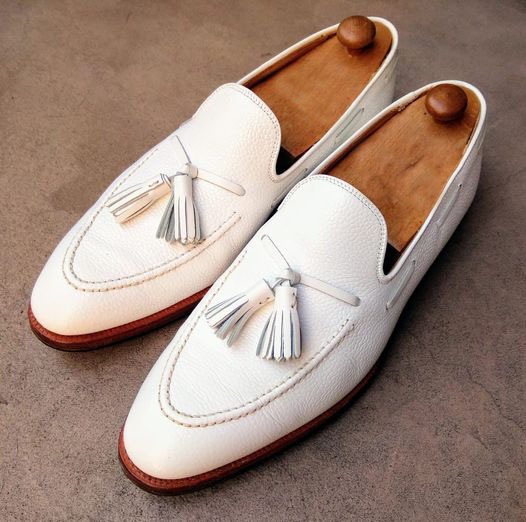 Elegant Men's Hand Stitch White Tassels Loafers Leather Shoes