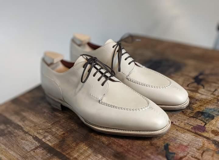 Men Handmade White Leather Beautiful Stitched Split Toe Laceup Formal Dress Shoes