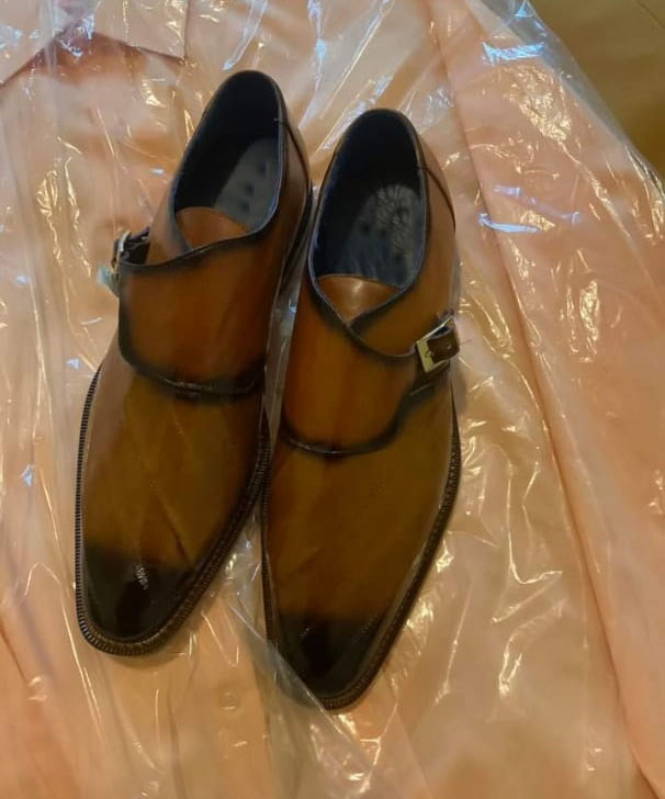 Men suiting wear brown leather tow tone formal monk handmade leather shoes