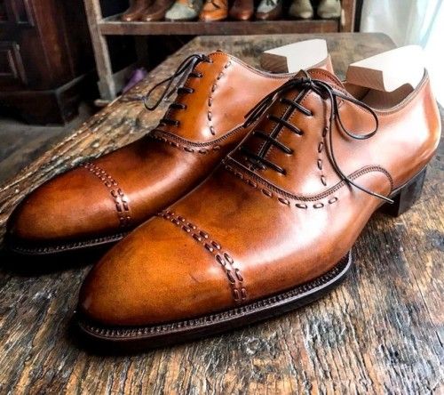 MENS BROWN CROSS STITCH CAP TOE DRESS LACE UP SHOES HANDMADE MEN WEDDING SHOES