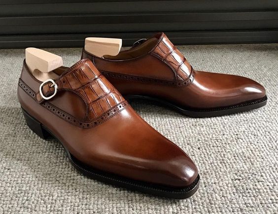 Unique Men's Hand Stitch Brown Alligator Touch Shoes, Single Monk Strap Leather Wedding Wear Shoes