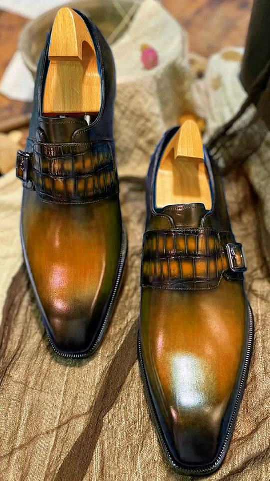 Men's Tan Black Polishing Alligator Leather Skin Handmade Stylish Monk Dress Shoes