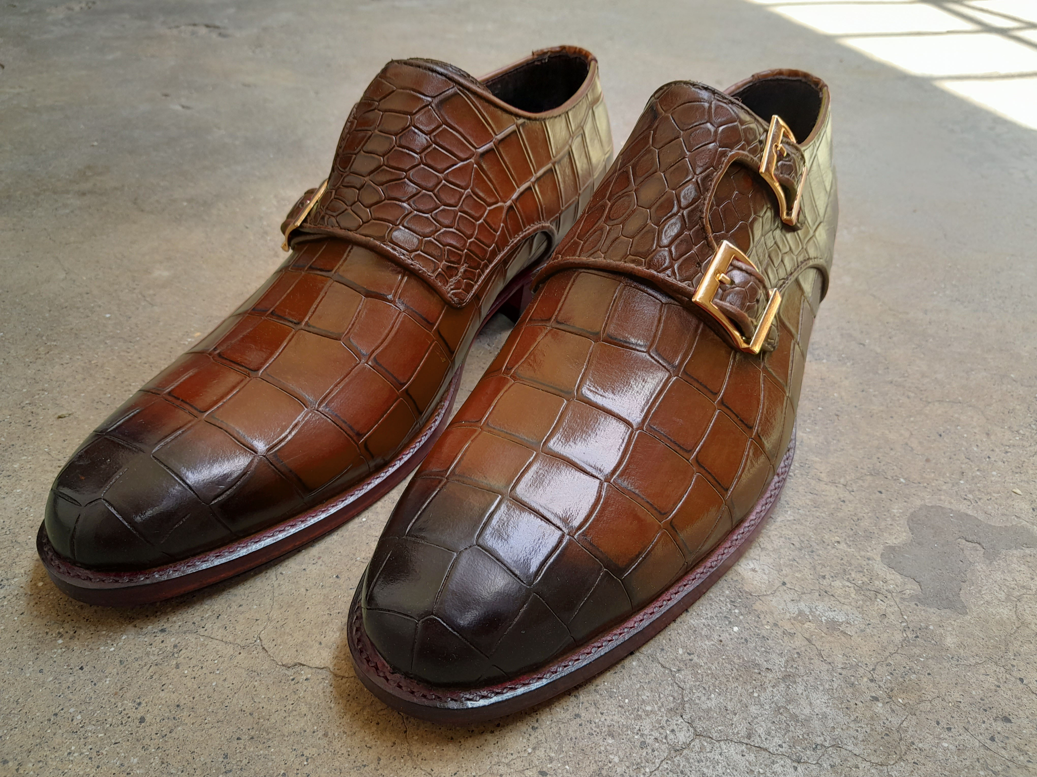 Men's Exotic Looks Attractive Brown Alligator Skin Texture Handmade Monk Shoes
