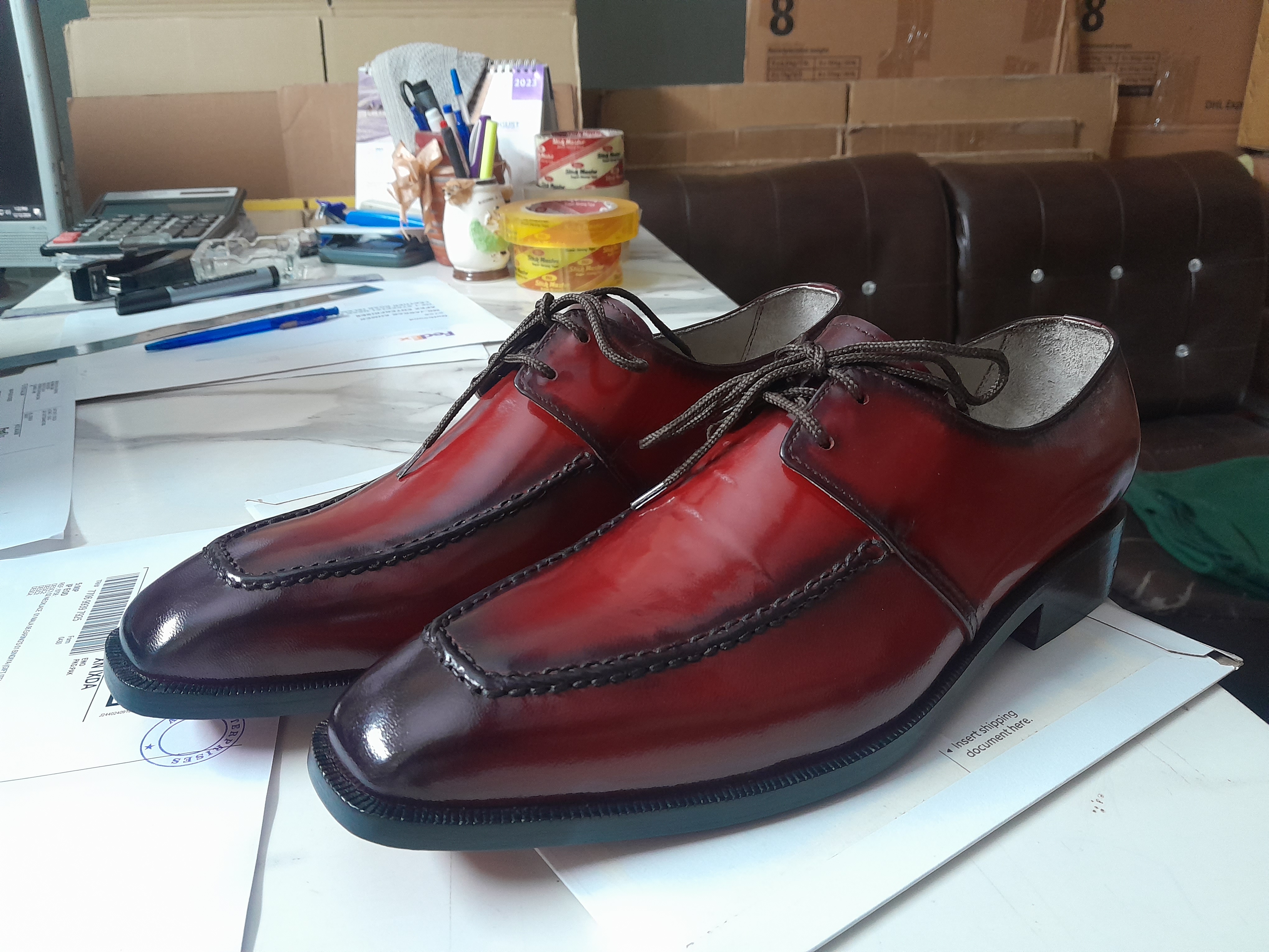 Men's Handmade Red Patina Two-Tone Lace-Up Shoes. Expertly crafted for the modern gentleman, these shoes feature a striking red patina finish and a unique two-tone design, ensuring you stand out at any formal or smart-casual occasion.